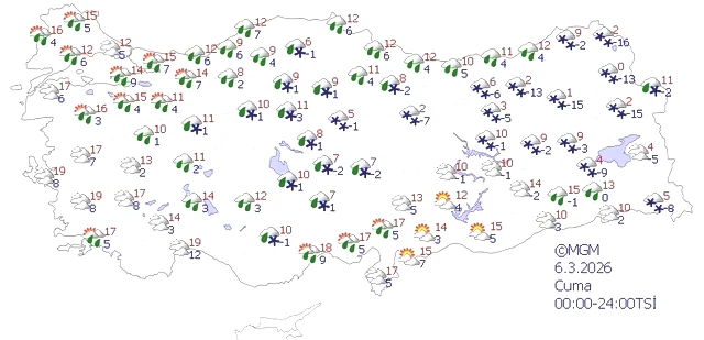 Meteoroloji Genel Müdürlüğü tarafından yapılan dakik değerlendirmelere göre, ülke genelinde hava durumu parçalı ve çok bulutlu olarak ilerleyecek. Marmara (İstanbul dışında), Orta ve Doğu Akdeniz, İç Anadolu, Karadeniz, ve Doğu Anadolu’nun kuzey kesimlerinde ile birlikte Isparta, Afyonkarahisar ve Kütahya çevrelerinde yağmur ve sağanak yağışlar bekleniyor. İç bölgelerde ise yer yer karla karışık yağmur ve kar yağışlarının olacağı öngörülmekte. Gece ve sabah saatlerinde iç ve doğu kesimlerde buzlanma ve don olayları yaşanabilir. Doğu Karadeniz’in yüksek kesimleri ve Doğu Anadolu’nun eğimli, kar örtüsüne sahip alanlarında çığ ve kar erimesi riski bulunmaktadır.